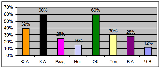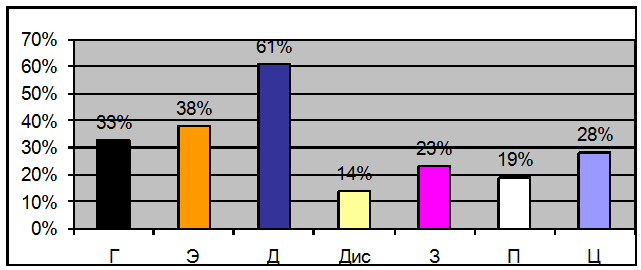 Как видно из Рис.1 в данном коллективе подростков значительно преобладает демонстративный тип характера. Людей с демонстративным типом характеризует легкость установления контактов, стремление к лидерству, жаждой власти и похвалы, склонность к вытеснению, демонстративностью поведения, живостью, подвижностью. Этот тип демонстрирует высокую приспособляемость к людям и вместе с тем склонность к интригам. Такие люди раздражают окружающих своей самоуверенностью, высоким уровнем притязаний. Систематически сами провоцируют конфликты, но при этом активно защищаются. Обвинительны, артистичны, обходительны, проявляют неординарность в мышлении и поступках.