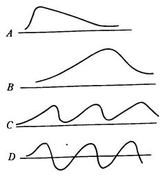 Линии изображают два типа астенической формы: типы астенической формы были бы совершенно подобны, с той только разницей, что кривая находилась бы ниже абсциссы. Тип А, а также и подобный ему отрицательный тип соответствует всем аффектам, которые происходят от внезапного восприятия извне: это, следовательно, самая обыкновенная форма аффекта, особенно аффектов восприятия, которые возникают, например, при виде какого-нибудь предмета или при получении известия. Сюда же следует отнести и гнев и испуг, причем первый возбуждающего, а второй угнетающего характера. Тип В соответствует аффектам, похожим на настроения, которые вырастают понемногу из внутренних мотивов, особенно из размышлений с сопровождающими их чувствами. Эти аффекты — удовольствие, надежда или при отрицательной кривой — забота, горе, печаль. Если аффект длится более продолжительное время, то эти простые формы течения осложняются, так что получается не одно связное движение вверх и вниз, а возобновляющееся несколько раз или даже перемещающееся движение аффекта, а в некоторых случаях даже движение, колеблющееся между двумя противоположными настроениями. Возобновляющийся тип изображен при помощи кривой С. Колеблющиеся аффекты, переходящие от возбуждения к угнетению и обратно, принадлежащие к типу D.