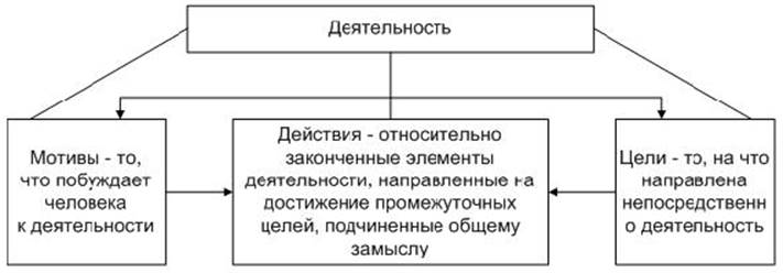 Деятельность — активное взаимодействие человека со средой, в котором он достигает сознательно поставленной цели, возникшей в результате появления у него определённой потребности, мотива. Деятельность – мотивы, т. е. то, что побуждает человека к деятельности; действия – относительно законченные элементы деятельности, направленные на достижение промежуточных целей, подчинённые общему замыслу; это цели, т.е. то, на что направлена непосредственно деятельность.